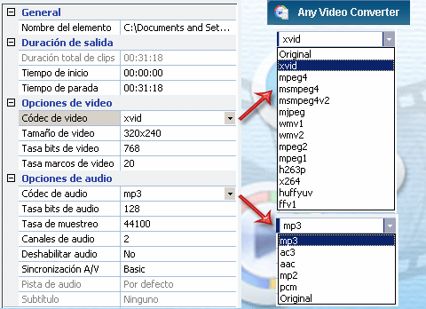 Permite modificar de manera independiente todos los parámetros de vídeo (codec, tamaño, bits o frames del vídeo) y de audio (codec, bits, muestreo, canales de audio, tipo de sincronización). Controlando ademas la duración del vídeo de salida que se desea obtener (tiempo de inicio y parada).