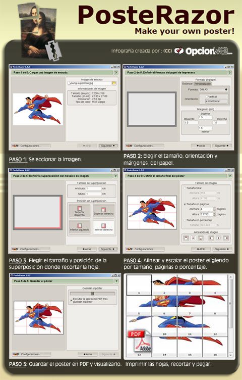 Un software que en 5 sencillos pasos te asiste para subir la imagen, configurar las características del papel de impresión, los margenes, las zonas de recorte donde encajar y pegar las distintas partes del poster gigante y varias opciones para elegir las dimensiones que deseas que ocupe el mega póster. El programa procesa la información y se obtiene un fichero PDF para imprimir las distintas hojas del mosaico que formará el póster gigante.